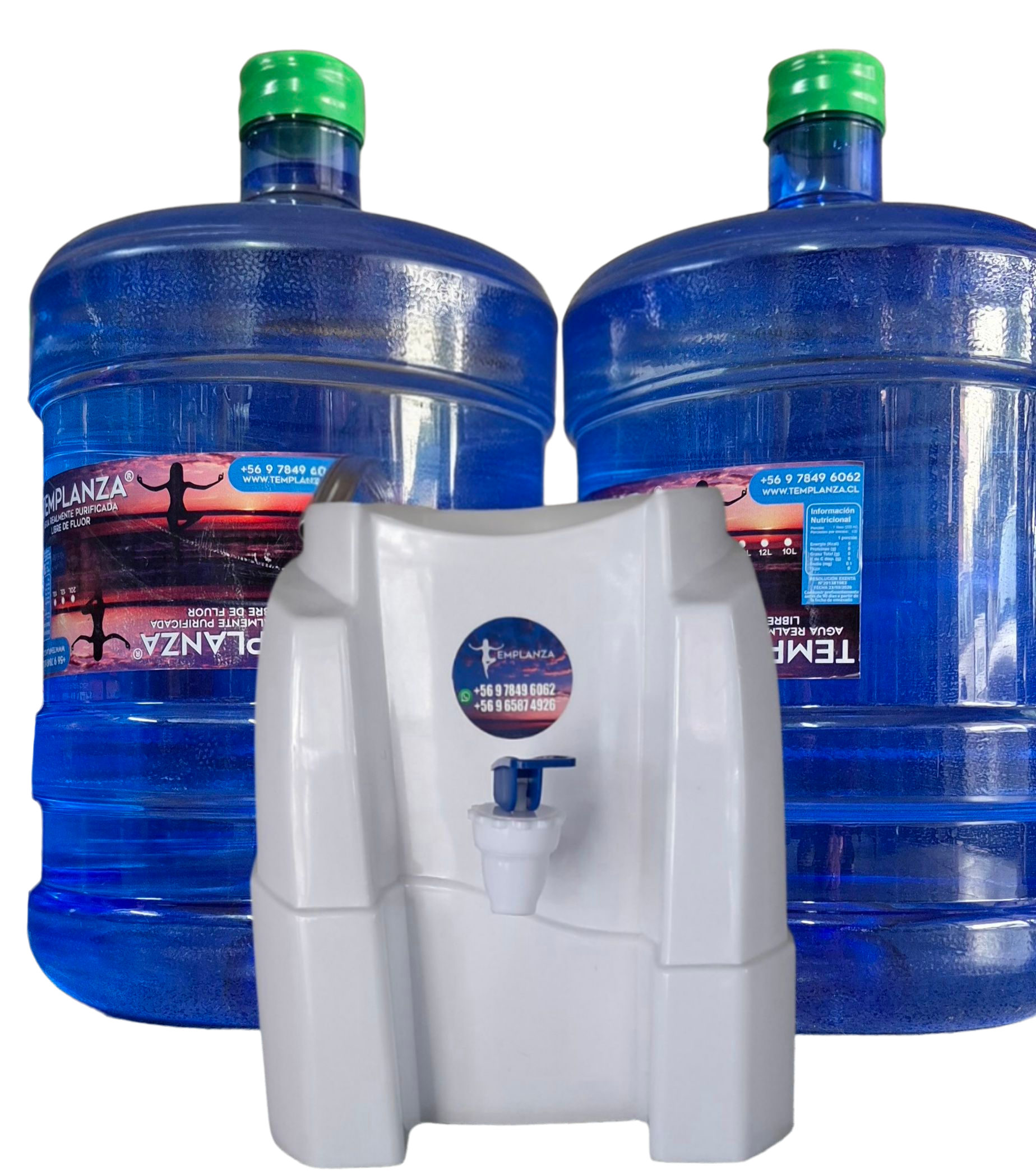 Este kit está formado por dos botellones de 20 litros con agua Templanza más un dispensador básico de sobremesa.